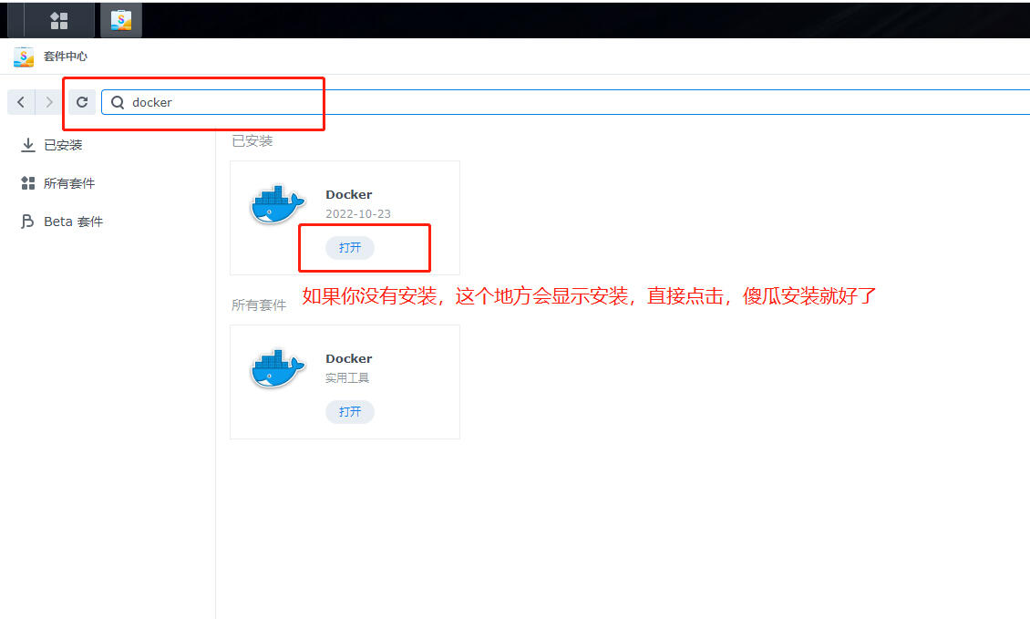 打开群晖的套件中心,直接搜索Docker安装