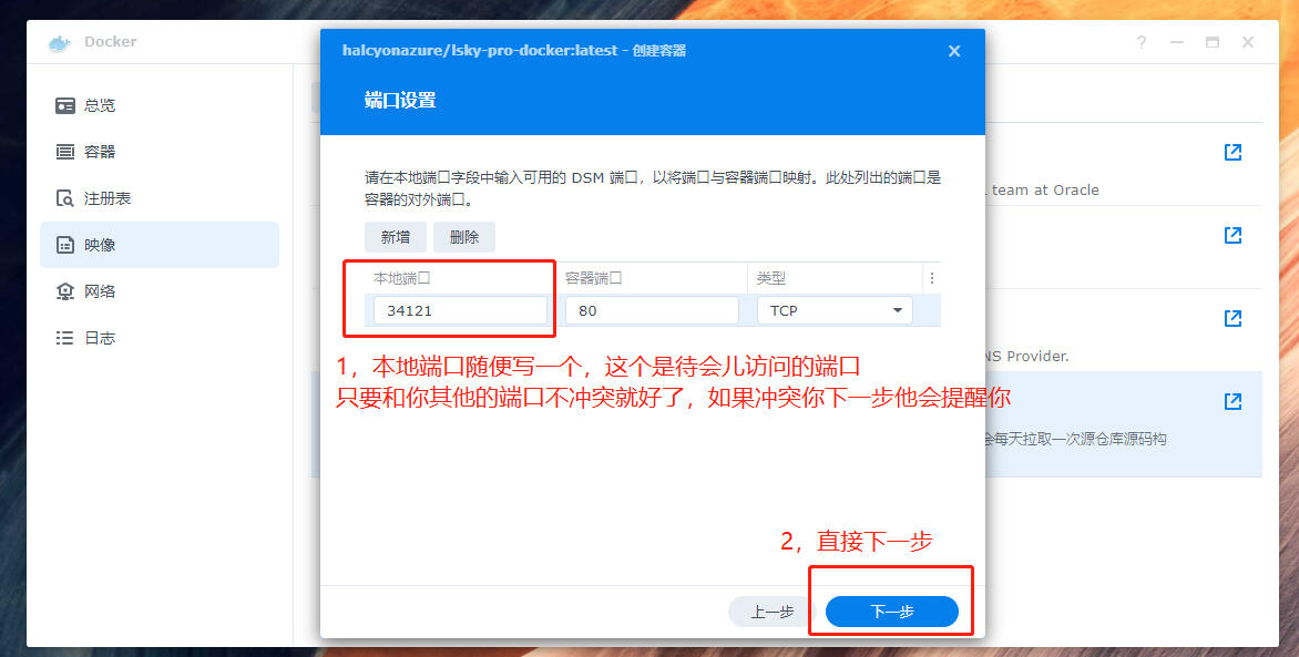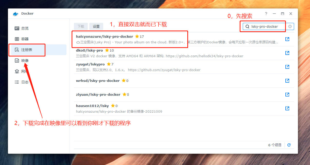 第二部,安装好Docker之后点击打开,点击Docker的左边的注册表,按照下面的图依次,先搜索兰空图床的程序 lsky-pro-docker,第一个画框的就是,双击下载,会跳出来让你选择版本,直接选择最新版本 Latest 就好了。这里需要一点时间。