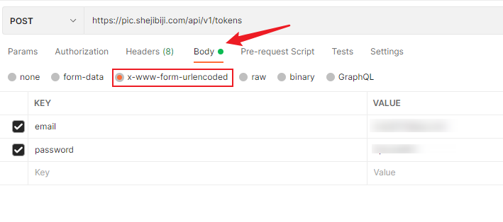 在请求体(Body)中,我们分别填入邮箱和密码的KEY和对应的值。